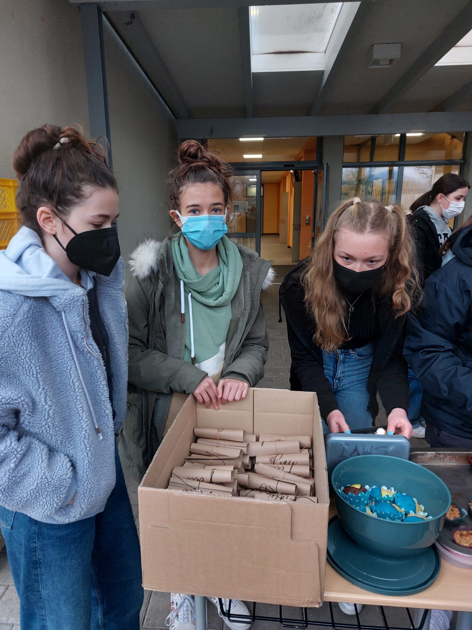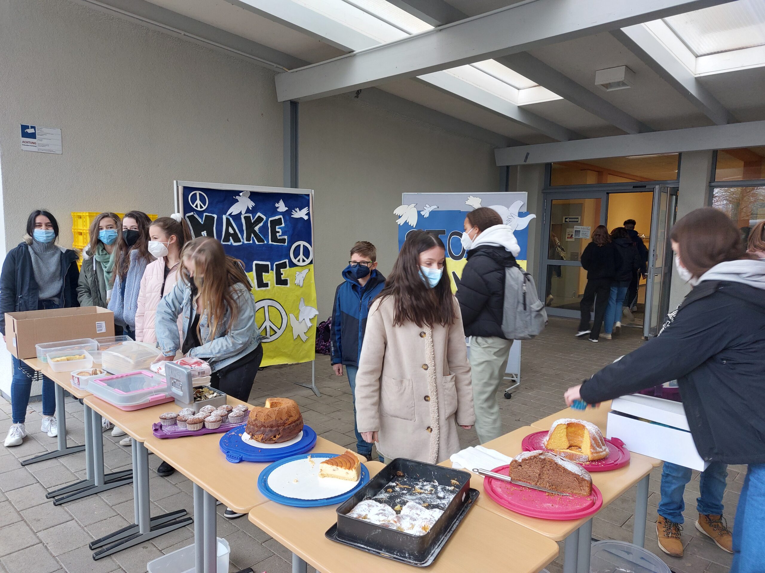 Daher verständigte man sich in Absprache mit dem Schulleiter des GGG, Herrn Bernhard Krabbe, und dem Verein „Ukrainer in Karlsruhe e.V.“ darauf, zunächst Geldspenden am GGG zu sammeln, die zu einem späteren Zeitpunkt für einen gemeinsamen Aktivitätstag mit den geflüchteten Kindern aus der Ukraine verwendet werden sollen. Der restliche Geldbetrag wird direkt an den Verein fließen, der damit ukrainische Flüchtlingskinder, die nun in der Umgebung leben, gezielt unterstützen will. Dazu öffnete die SMV vom 16.03.-23.03. jeweils in der ersten und zweiten großen Pause ihren Spendenstand, sodass alle Schülerinnen und Schüler sechs Tage lang Zeit hatten, direkt in der Schule ihre Spenden abzugeben. Darüber hinaus organisierte die SMV am Freitag, den 01.04. einen Kuchen- und Armbandverkauf, dessen Reinerlös ebenfalls in den Spendentopf floss. Viele fleißige Bäckerinnen und Bäcker aus allen Jahrgansstufen sorgten für ein buntes Kuchenbuffet, von dem am Ende des Tages nahezu nichts übrig blieb. Doch nicht nur die Kuchen, sondern auch die Armbänder wurden selbst produziert. Das Peace-Zeichen, das einige geschickte Schülerinnen und Schüler kunstvoll in das Armband knoteten, soll alle Trägerinnen und Träger der Bänder stets daran erinnern, wie wertvoll Frieden ist.